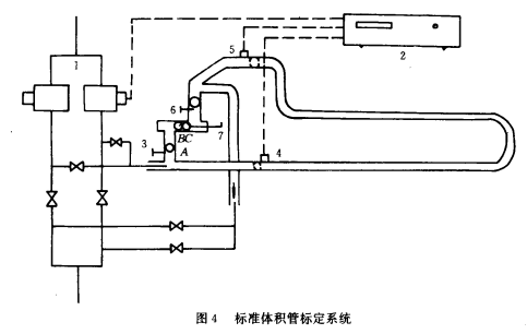 由于標(biāo)定系統(tǒng)難免有殘存液體,尤其是粘性較大時附著在壁面上的液體,須另加沖洗系統(tǒng)和加熱系統(tǒng),使設(shè)備復(fù)雜化。另外,容積法受容積誤差影響,質(zhì)量法受管路系統(tǒng)支撐系統(tǒng)影響,測量精度受到限制,近代出現(xiàn)的標(biāo)準(zhǔn)體積管具有精度高、系統(tǒng)簡單、占地面積小、便于在線標(biāo)定、容易配合計算機進行實時標(biāo)定,尤其適于粘性液體,被公認(rèn)為*佳的粘性液體流量標(biāo)定裝置。其基本原理是檢測通過一定容積液體所需時間,標(biāo)準(zhǔn)體積管的容積誤差為±0.35%。圖4為標(biāo)準(zhǔn)體積管標(biāo)定系統(tǒng)原理圖,工作順序為:拔出銷3,球A落入管道,再插進銷3,球A被流動的液體推動到檢測器4時,檢測器給計時器發(fā)信號,開始計時,球A到達檢測器5時,給計時器發(fā)出停止計時信號,計量結(jié)束。2檢測器之間的體積一定,按所計時間求出容積流量。球A繼續(xù)前進,停在銷6處。推球器7退出,拔出銷,6,球A生落下,同B、C球并列,推進推球器7,使B球落下,用C、A2球密封,B球落在銷3上,同時插進銷6,等待下一次標(biāo)定。