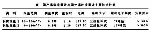 電池供電渦輪流量計與國外渦輪流量計的主要技術(shù)性能如表l所示。表1中為采用公稱直徑為100的傳感器測量范圍。