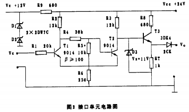 調(diào)試時,先將接口單元的輸出端接1k電阻,然后將輸入端接1.5V電壓,逐步減小電阻R5的值,直至輸出端電壓上升到10V;若不能達到此值,則可能是三*管T3的直流放大倍數(shù)過低。逐步降低輸入端的電壓直至1.2V,此時輸出端應(yīng)為零。若不能可靠地回零,則可能是電阻R5的值過小。
